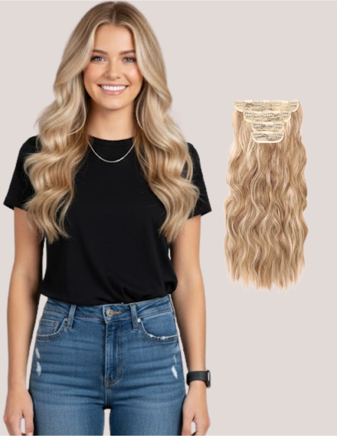 Extensiile clip-on ondulate de 55 cm din fibră termorezistentă sunt o soluție rapidă și accesibilă pentru a adăuga instantaneu lungime (55 cm) și volum coafurii, având o textură ondulată bogată. Se aplică ușor prin prindere cu clipsuri, fiind ideale pentru evenimente sau purtare ocazională.