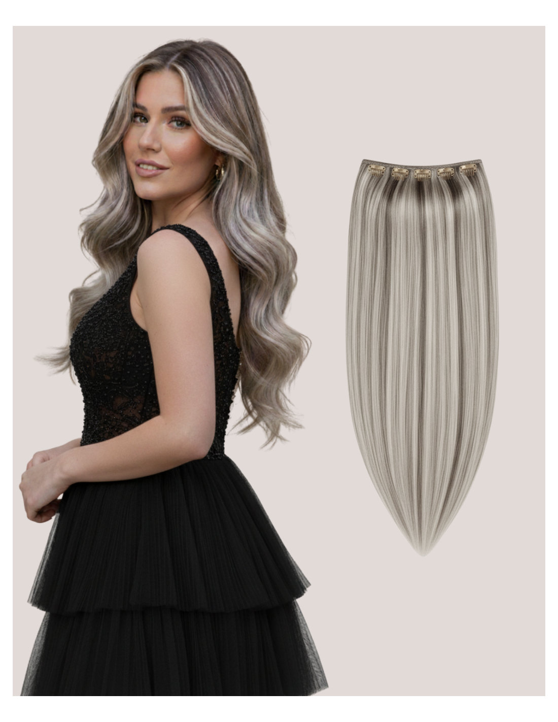 - Sistem de Prindere: Tresa este echipată cu 5 clipsuri cu silicon pentru o fixare ultra-rapidă, maximă stabilitate și protecția firului de păr natural.